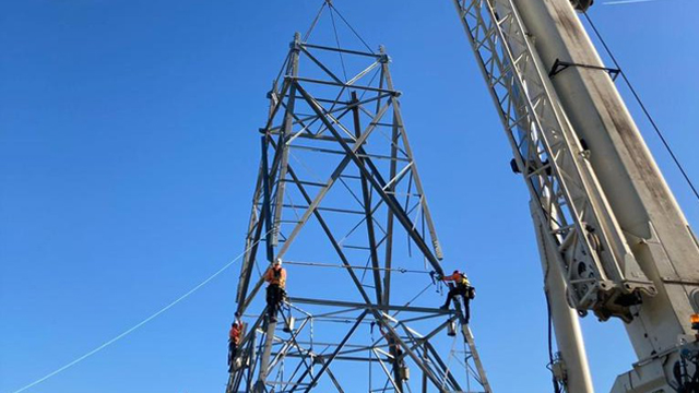 With the towers now up, the team has begun the conductor stringing phase, where wires are pulled and secured in their mounts.